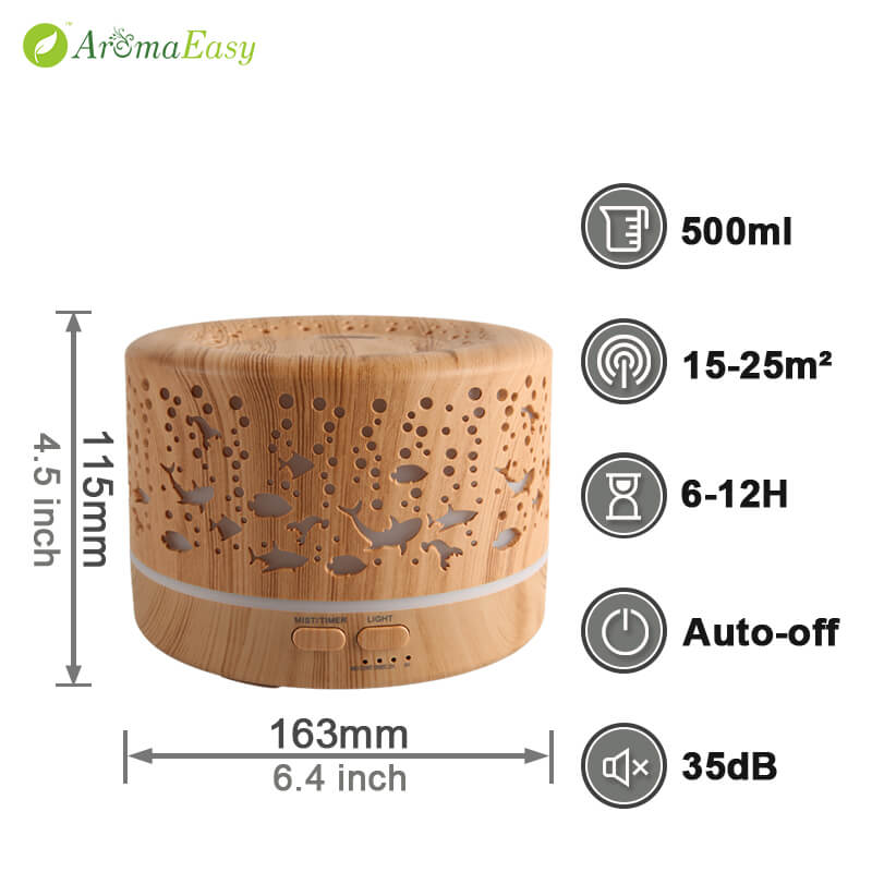 - 【500ml large capacity】 : This aroma diffuser can work up to 10 hours with a capacity of 400ml. It can generate 30-50ml of mist per hour and cool 10-60. The natural-style wood grain easily fits into most room décor.